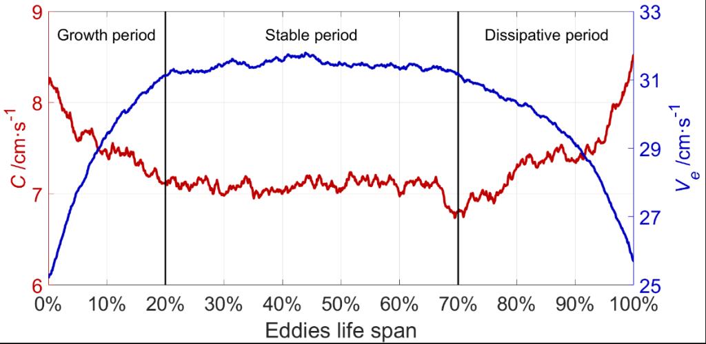 图1. 南海中尺度涡平均移速(红线)和转速(蓝线)在生命周期内的变化。