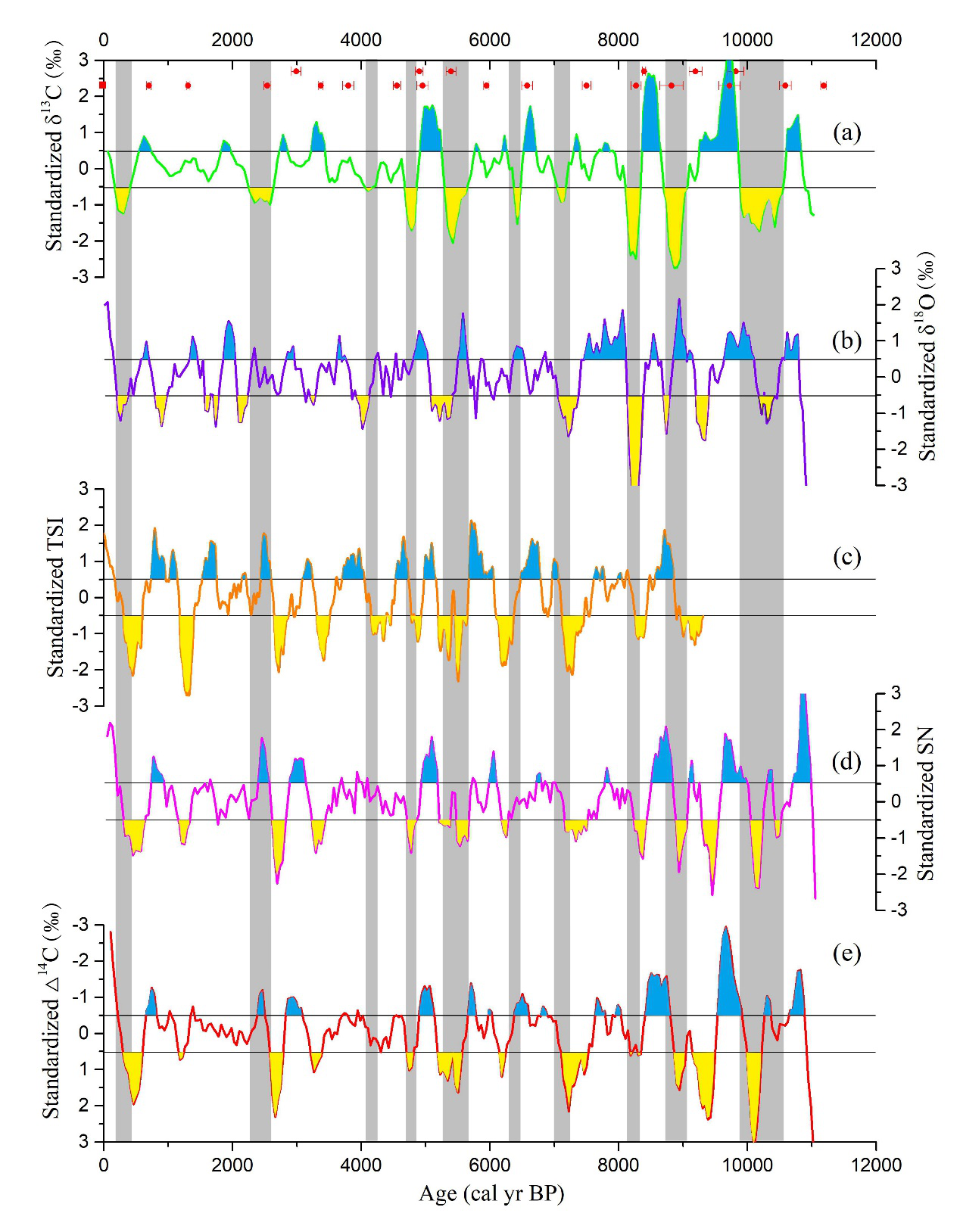 我院海洋地质团队成员黄超经过反复的条件实验,建立了适合泥炭岩芯样品的α-纤维素提取方法,基于在北疆阿勒泰山获取的长达7.5m的泥炭岩芯,开展α-纤维素碳同位素研究,并结合在泥炭地海拔梯度上开展为期2年的现代观测结果(图1),论证了阿勒泰泥炭α-纤维素碳同位素是一个比较可靠的古温度指标,重建了该研究区域过去11500年以来夏季温度的演化历史(Rao and Huang, 2019)。并且发现该区域夏季温度还呈现千年尺度和百年尺度的波动变化特征。千年尺度上,阿勒泰泥炭α-纤维素碳同位素清晰的记录了数次明显的气候突变事件,与北大西洋浮冰碎屑事件具有较好的对应关系(图2),说明北大西洋的温度变化可通过西风环流对中亚干旱区的温度产生一定的影响。百年尺度上,将阿勒泰泥炭α-纤维素碳同位素记录、太阳活动指标(TSI、SN以及△14C)同时进行标准化处理,剔除长期变化趋势,获得百年尺度的变化信息,并进行对比分析。结果发现,阿勒泰地区的夏季温度的异常变化刚好与减弱的太阳活动吻合(图3),说明百年尺度上阿勒泰地区的夏季温度变化主要受到太阳活动的影响。为了进一步确定阿勒泰地区夏季温度与太阳活动之间的关系,我们对阿勒泰泥炭记录与太阳活动指标SN和△14C分别进行时间序列的滤波分析和交叉谱分析,结果发现存在数个显著的百年太阳活动周期。这些对比分析进一步表明,阿勒泰地区百年尺度的温度异常变化受控于太阳活动的影响。