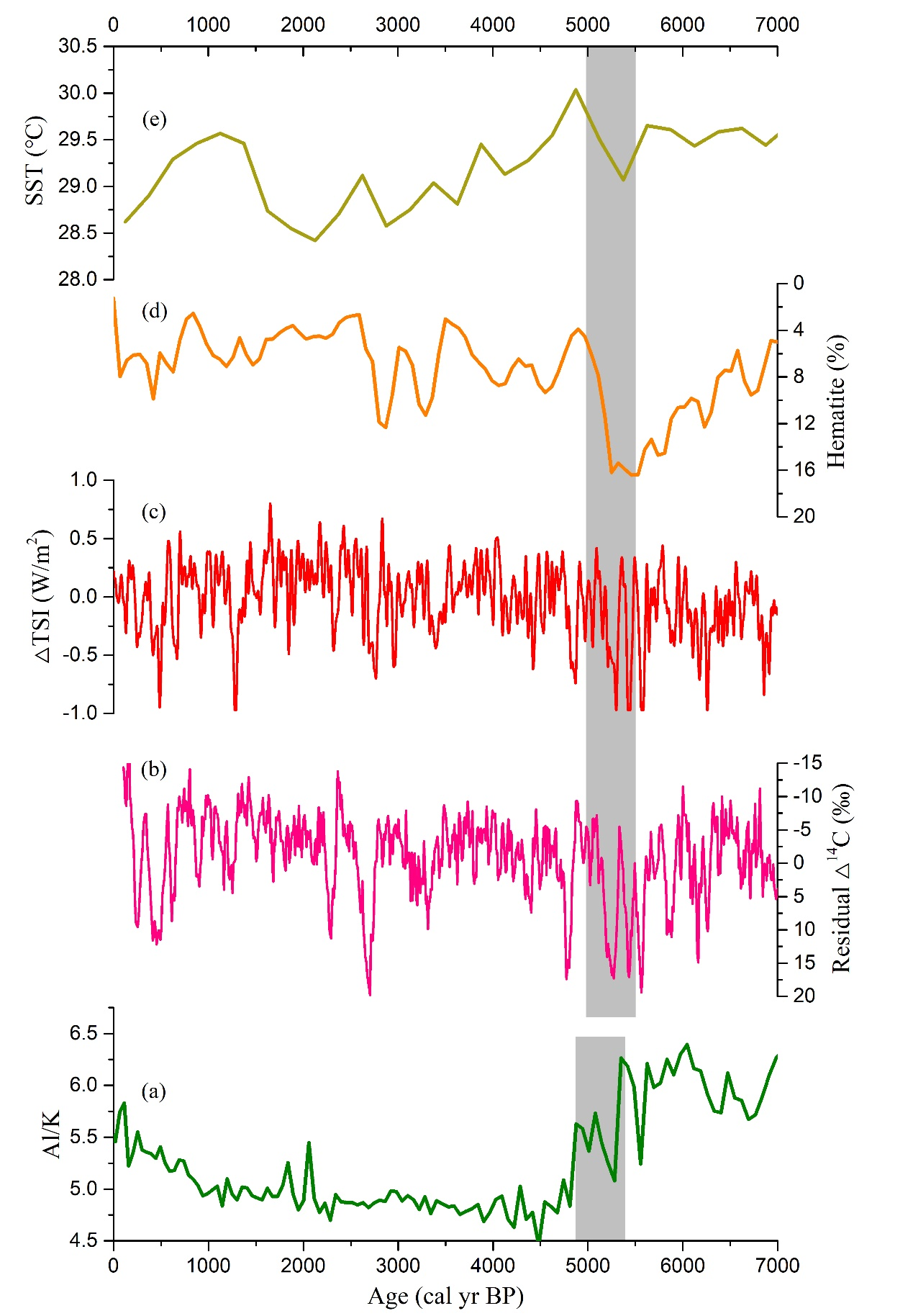 我院海洋地质团队成员黄超博士利用采自琼东海域大陆架GH6岩芯 (图1),通过AMS 14C测年建立岩芯的年龄–深度模式,进而开展高分辨的过去7000年气候演化与人类活动影响的重建工作。结果发现,在5400-4900 cal yr BP期间琼东地区发生了一次显著地气候突变事件,这与季风区其他研究发现的弱季风事件一致。该弱季风事件刚好与减弱的太阳活动、较强的ENSO活动以及北大西洋冰伐事件发生的时间吻合(图2),表明太阳活动可以通过影响ENSO系统和北大西洋对亚洲夏季风产生重要影响。近1500年以来,GH6岩芯记录的化学风化和陆源输入逐渐增强,且岩芯沉积物中的低频和频率磁化率大幅度增加,金属元素Cu和Pb的含量也迅速增加(图3)。这些岩芯沉积记录的增加趋势与海南岛的开发历史基本一致。然而,亚洲季风区多种地质载体的研究结果发现,夏季风在近1500年呈现整体减弱的变化(图3)。我们推测,由于人口的增加、农业生产的发展以及采矿冶炼活动的扩张,引起土壤侵蚀的增强和金属元素含量(Cu和Pb)的增加,进而导致陆源输入到近海陆架上沉积物的增加。因此,近1500年以来,琼东地区逐渐增强的人类活动取代了自然气候条件成为地表环境改造的主要控制力量。