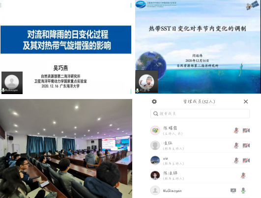 12月16日上午,自然资源部第二海洋研究所的吴巧燕研究员和闫运伟副研究员通过线上会议为我院师生作了精彩报告。首先吴巧燕研究员作了题为“对流和降雨的日变化过程及其对热带气旋增强的影响”的学术报告。吴老师在报告中介绍了台风过程中对流和降雨的日变化过程及其对热带热带气旋增强的影响。发现台风降雨和对流的日变化特征,揭示了具有日变化特征的对流过程如何影响台风的结构和强度,从而表明太阳辐射的日夜差异影响台风这种强烈天气过程的可能性。