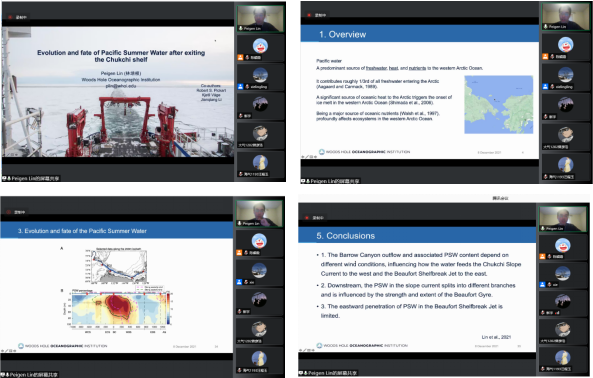 林培根博士以“Evolution and fate of Pacific Summer Water after exiting the Chukchi shelf ”为题,林博士首先为我们简要介绍了楚科奇海的整背景流场以及相关的水团,接着讲解了太平洋夏季水Barrow Canyon如何从楚科奇海离开进入深海盆,以及进入深海盆之后是如何演化直至最终消失。林博士认为楚科奇海附近水团的出流主要受局地风的影响,流出水团进入深海盆下游以后往西受Beaufort Gyre的大小和强度影响而改变路径可能流向海盆中间,也有可能沿着陆架一直往西;而水体往东则是受径流影响减弱向东趋势。