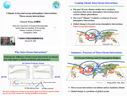 王春在研究员作了题为“Climate is beyond ocean-atmosphere interactions: Three-ocean interactions”的学术报告。王老师的报告主要围绕三大洋相互作用与气候的主题展开。王老师首先强调了海洋与气候的研究在国家需求和国际前沿方面的重要性,通过回顾海洋与大气相互作用的研究历史和已经取得的重要研究成果,提出在未来的气候研究中要更加关注三大洋相互作用方面的研究。紧接着,王老师又进一步阐述了需要重点关注三大洋相互作用的具体原因,并详细阐述了太平洋、印度洋和大西洋之间可以发生的洋盆间相互作用的过程和机制。最后,王老师的报告对三大洋相互作用的未来研究进行了展望。
