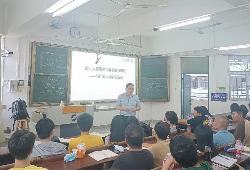 副院长陈法锦教授主讲的本科生课程《海洋生物地球化学》,接着,蔡教授结合课程教学大纲内容,做了主题授课。在课堂上,蔡教授从地球系统科学的角度介绍了海洋环境污染问题的本质,深化同学们对海洋生物地球化学的认识,增强了同学们利用地球科学系统的思维去研究海洋问题的能力。最后,还与同学们积极互动,引导大家深入思考。通过蔡教授的指导,我院学生对海洋生物地球化学有了更深入的理解和认识。