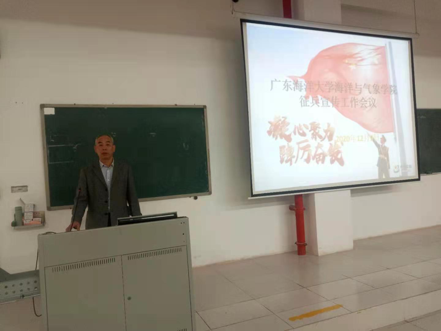 积极营造浓厚宣传氛围,采用线上线下相结合的方式,在海洋科技楼的电子屏幕中播放宣传标语,在班级微信群发放征兵资料和公布全国征兵网的网址链接;以退伍的学生为主组建征兵宣队伍,积极以“征兵和国防教育报告会”“先进典型事迹宣讲会”的形式,用身边人讲述身边故事,用身边事带动身边人,鼓励和引导更多大学生参军入伍。
