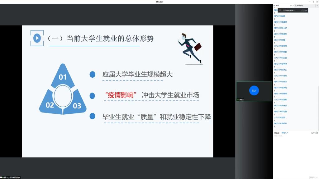 课堂开始,黄老师列举了三个案例为我们分析了目前的就业形势。案例分别为湖南省2019年公务员全省报考人数将近10万,其中最热门职位招录1人,但有553人竞争;2019年度公务员用人单位通过资格审查人数较去年减少了28万人左右;2019年国家公务员考试最激烈的三大职位,竞争比分别为4040、3662、3048,这三个案例充分说明了我国公务员岗位竞争的激烈程度。随后,老师列出了近年来研究生持续增高的报考人数。数据显示,2022年全国考研报名人数达到了史无前例的457万人,较2021年377万,激增80万,增幅达到了22.4%,考研增加人数和增长率均为近20余年来最高。不断激增的数据表明了当前考研形势的严峻。与此同时,大学应届生就业也面临诸多困难与挑战:应届大学生毕业规模超大、“疫情影响”冲击大学生就业市场以及毕业生就业“质量”和就业稳定性下降。当前,应届大学生规模超大,2022全国普通高校毕业生预计1076万人,比2021年增长166.5万人,同比增长18.4%,就业创业工作面临复杂严峻的形势,再创近10年毕业生人数新高值。此外,往届毕业生的对应届大学生冲击较大,仍有许多有就业意愿但未能就业的大学毕业生群体,分别有复习考研者、边看边干者、就业困难的大学生,他们也将参与下一届毕业生一起参与就业竞争。