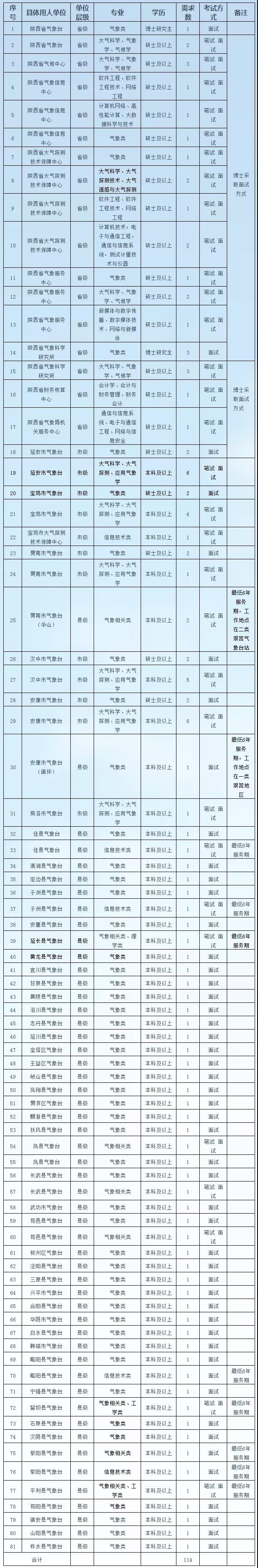 陕西省气象部门2022年度在国家气象系统编制内计划招聘高校毕业生114名,招聘方式采用面试或笔试+面试的方式。(具体情况见下表)