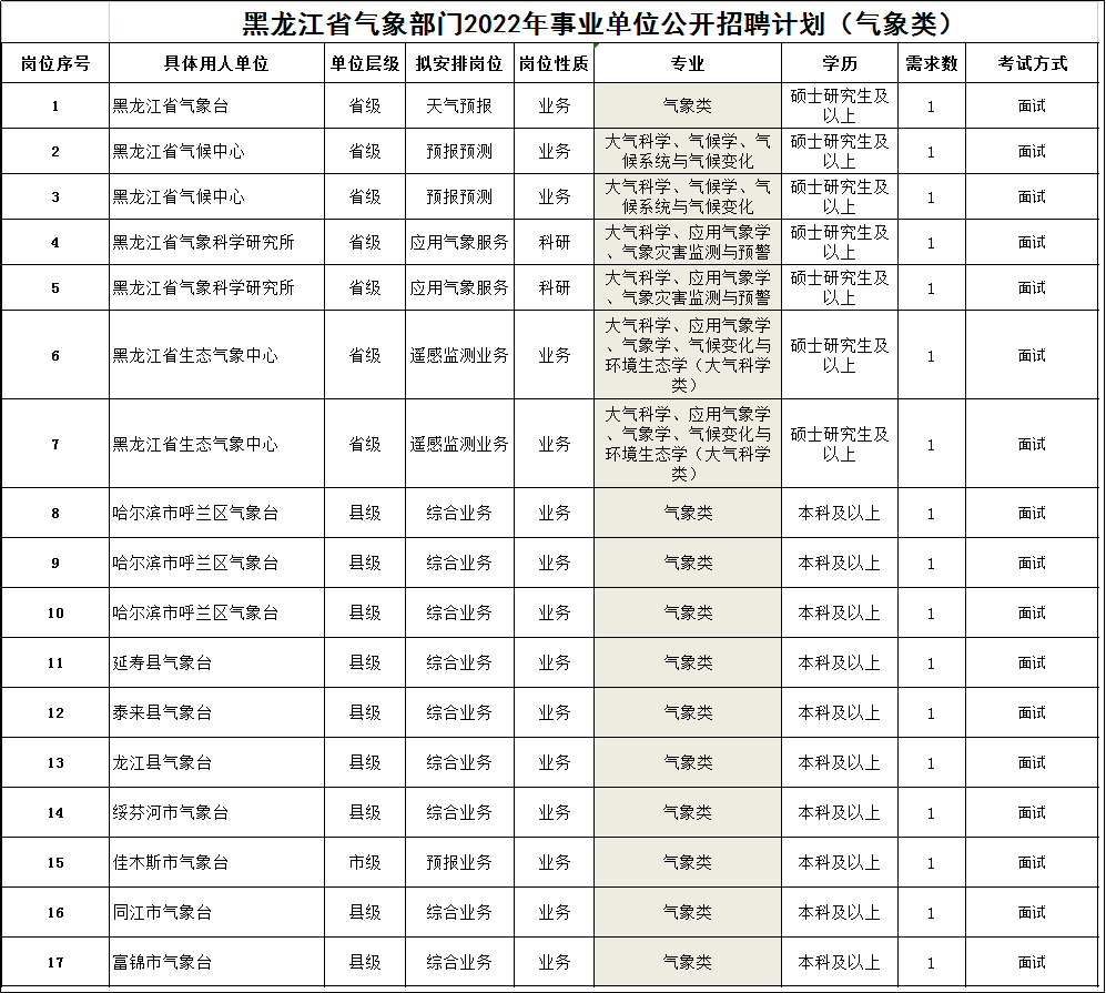 为推进人才强局战略,广泛引进高层次人才和业务岗位急需人才,黑龙江省气象局所属事业单位现公开招聘
