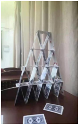 而在第三个环节“叠堡垒竞赛”中,同学们利用扑克牌在规定时间内摆成堡垒的样子,大家齐心协力,小心翼翼的将纸牌慢慢堆积。最终高新研、沈小琦小组所叠的堡垒最高,获得了第一名,大家对她们的心灵手巧都由衷佩服。通过游戏模拟试验,同学们深刻明白战争时战士们修建堡垒的艰辛,学习领悟革命先辈艰苦奋斗的精神。