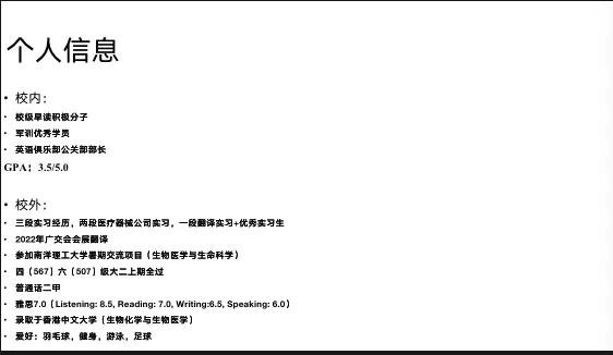李汶霖同学先是向我们介绍香港的大学排名,以及海洋科学可以申请什么专业的研究生,为有意留学的同学提供了目标,后详细说明材料的准备,顺水推舟谈及录取后工作,留学时间规划扫清未知的前方。