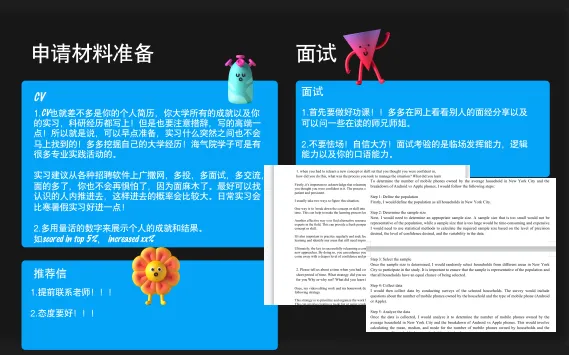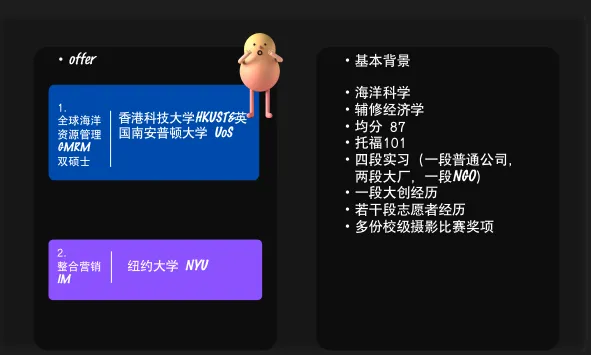 曹珂同学细致的向我们讲述如何申请境外硕士,首先将整个时间线拉出来,步步分析,严谨细致,让我们了解了如何挑选地区,标化考试的方法主要怎样进行,选择校区与文书准备,准备申请材料到面试的各个方面,每一步都很详细耐心,向我们展示了世上无难事,只要肯登攀的精神。