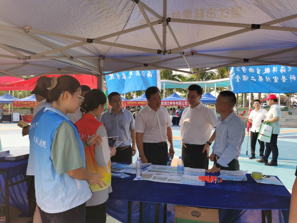 设置的摊位前吸引了不少前来参加活动的人们,他们驻足观看,对“蓝眼泪”、看云识天气、湖光岩地质等知识十分感兴趣,林海峰老师带领同学们对他们提出的问题一一解答,并发放宣传资料。湛江市科协主席郭荣波等市领导对优直播