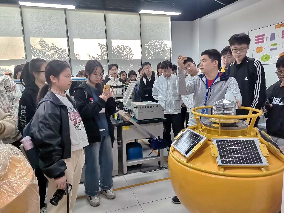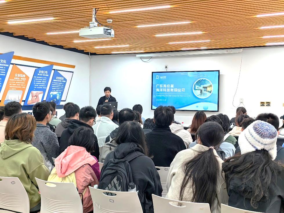 同学们接下来参观了广东海启星海洋科技有限公司,公司致力于推动新一代信息技术与海洋智能装备、海洋经济深度融合,打造标准化的产品研发和定制化服务体系。参观过程中,同学们在工程师的带领参观了公司展厅,工程师详细介绍了公司业务涉及到的重点技术,包括海洋动力灾害疏散路径智能规划系统、智慧渔业数字孪生平台等。同学们也参观了产品研发中心的一系列先进的海洋监测设备,主要包括分体式“永不沉没”浮标、自动气象观测系统、智能警戒潮位标识、新型验潮站、风暴潮监测站等。我校校友-公司技术副总工程师沈煜帆给同学们讲述了公司在海洋预警减灾、海洋生态环境保护、海洋观监测装备、海洋空间资源利用与保护等方面的重要成果,并与同学们就海洋科学专业学习心得和就业展开了热烈的讨论,极大的丰富了同学们对海洋科学实践应用的认识,同学们受益匪浅。
