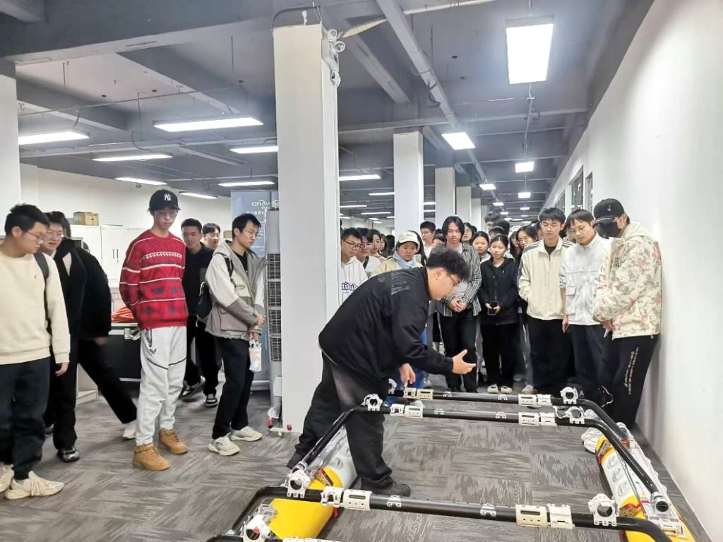 同学们接下来参观了广州至远海洋科技有限公司。首先,工程师带领大家参观了研发部门,这里主要负责开发和改进用于海洋探测与监测的各种设备,包括6000米深水摄像头、微光摄像头,中小型水下机器人,无人船、单波束测深仪、CTD等产品,针对机器人的工作原理和数据采集方式及无人船内部结构与搭载设备工程师进行了详细介绍。随后,工程师介绍了公司的主要业务方向,包括深入追踪海洋行业客户的实际应用需求,从事海洋仪器设备的自主研发和集成应用,助力海洋仪器设备的国产化推广与应用等,工程师还分享了一些公司在技术创新和服务客户方面取得的成绩和面临的挑战。此次参观使同学们获得了宝贵的第一手经验,加深了他们对海洋科技行业的理解,同时也激发了对未来职业发展的兴趣。