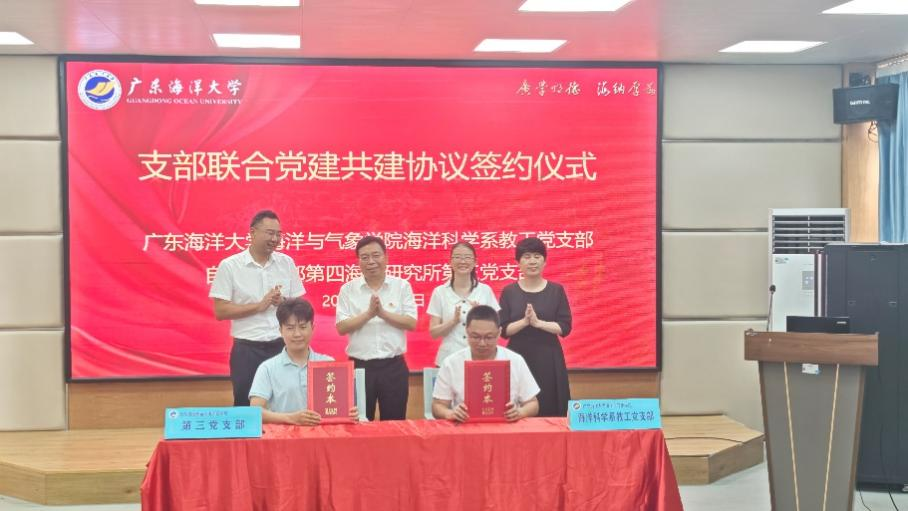 海洋科学系教工党支部与自然资源部第四海洋研究所第三党支部代表,在海科楼107会议室郑重签署共建协议。丰爱平所长、组织部正处级组织员曾令梅同志、优直播