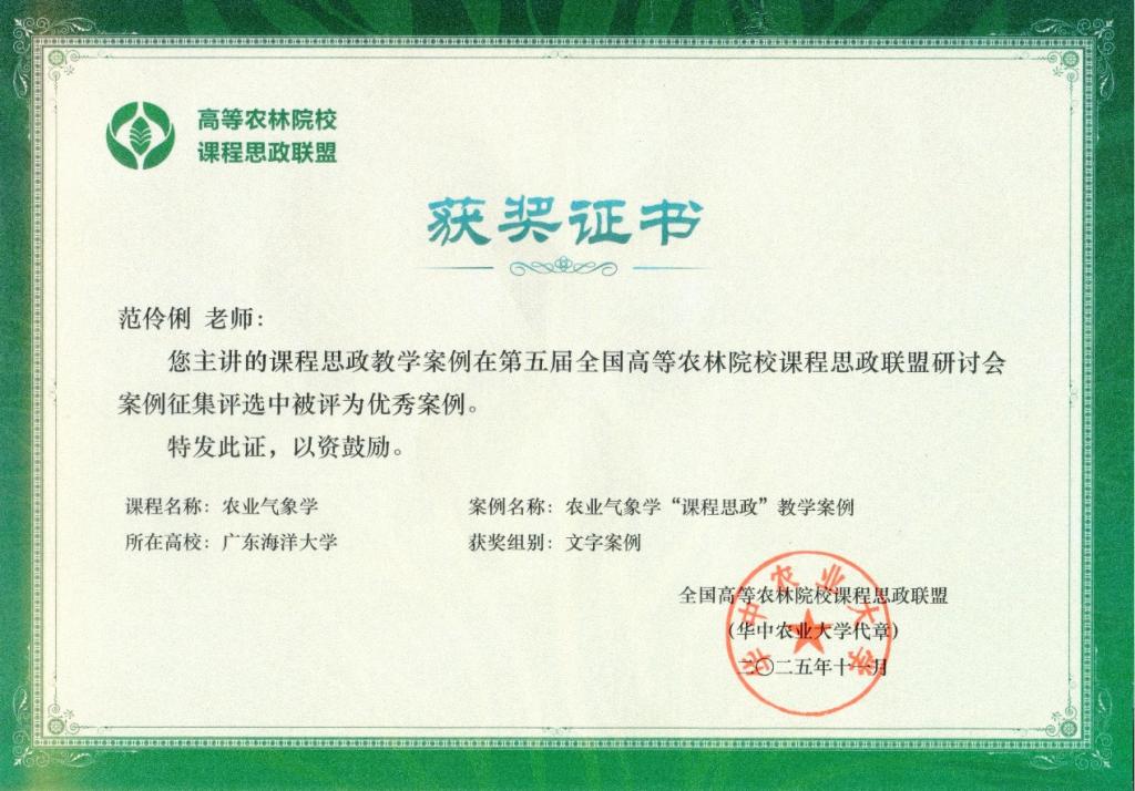 据悉,为了促进联盟高校间课程思政教学研究与交流,2025年11月,全国高等农林院校课程思政联盟向全国农林类高等院校公开征集文字和视频课程思政案例,从申报的219个文字案例和84个视频案例中,最终评选出71个优秀文字案例和30个优秀视频案例,我院范伶俐老师以省一流课程《农业气象学》为基础申报的《农业气象学“课程思政”教学案例》获评优秀课程思政文字案例。