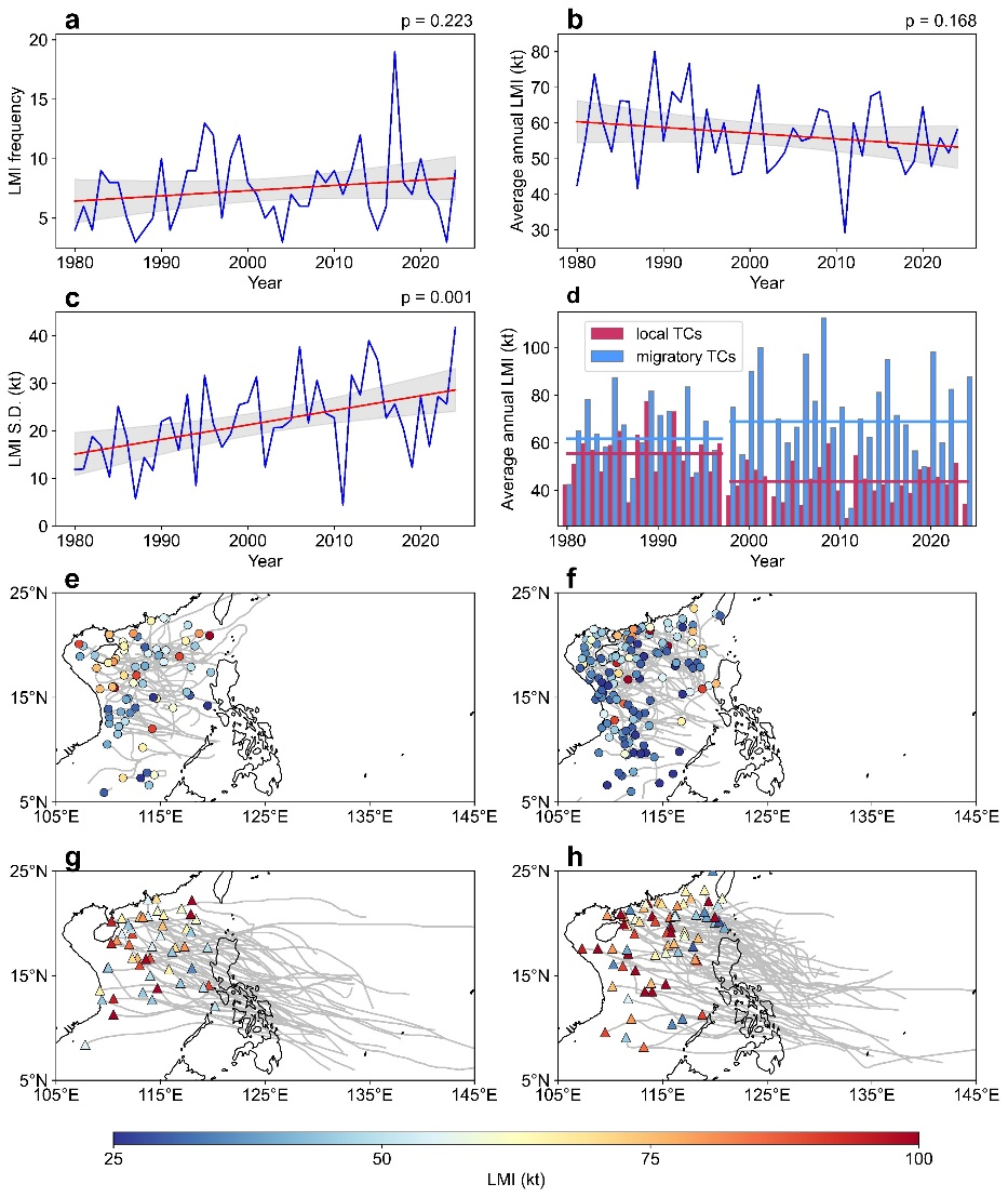 2025年11月25日,海洋气象研究院徐建军教授团队在地球科学领域国际学术期刊《Geophysical Research Letters》上发表题为“Increasing Variability in Tropical Cyclone Lifetime Maximum Intensity Over the South China Sea”的研究论文。该成果由优直播-英超直播优直播硕士研究生黄佩兰担任第一作者,梁梅副教授与涂石飞教授为通讯作者,徐建军教授及中山大学胡湛教授参与合作研究,在南海热带气旋(台风)最大生命强度(LMI)变化机制研究领域取得重要突破。