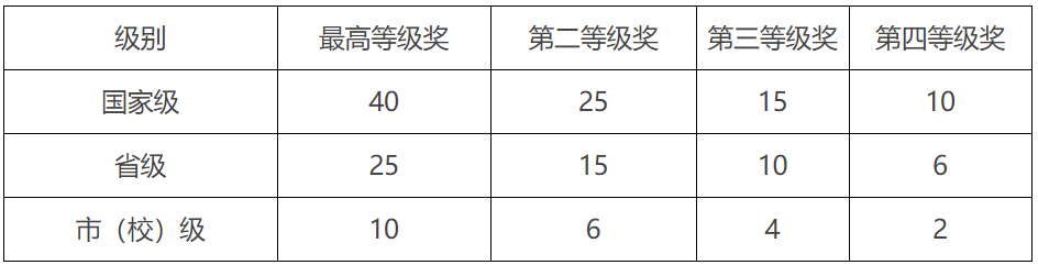 各类奖项完成者中排名第二至第五的学生分数分别=排名第一分数×0.6、0.5、0.4、0.3,获Ⅰ类国家级前三等级奖但未获优先推荐的按25分/人计。同一项目获不同级别奖励,不重复计分。