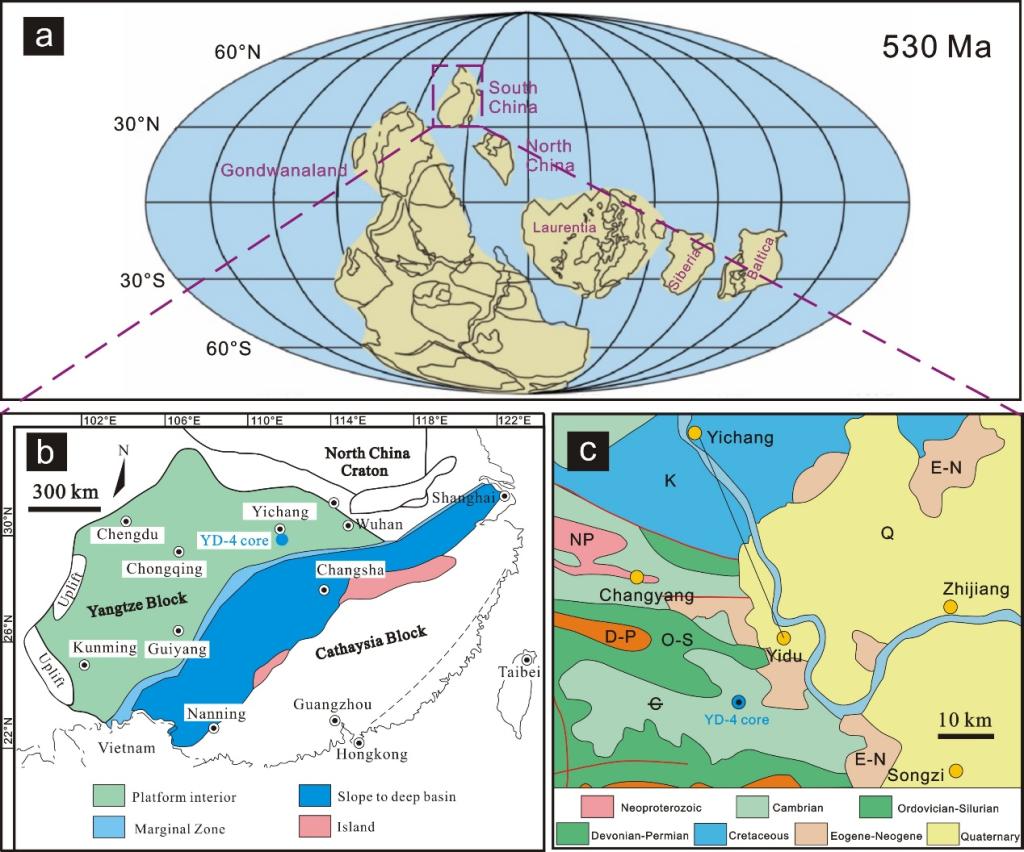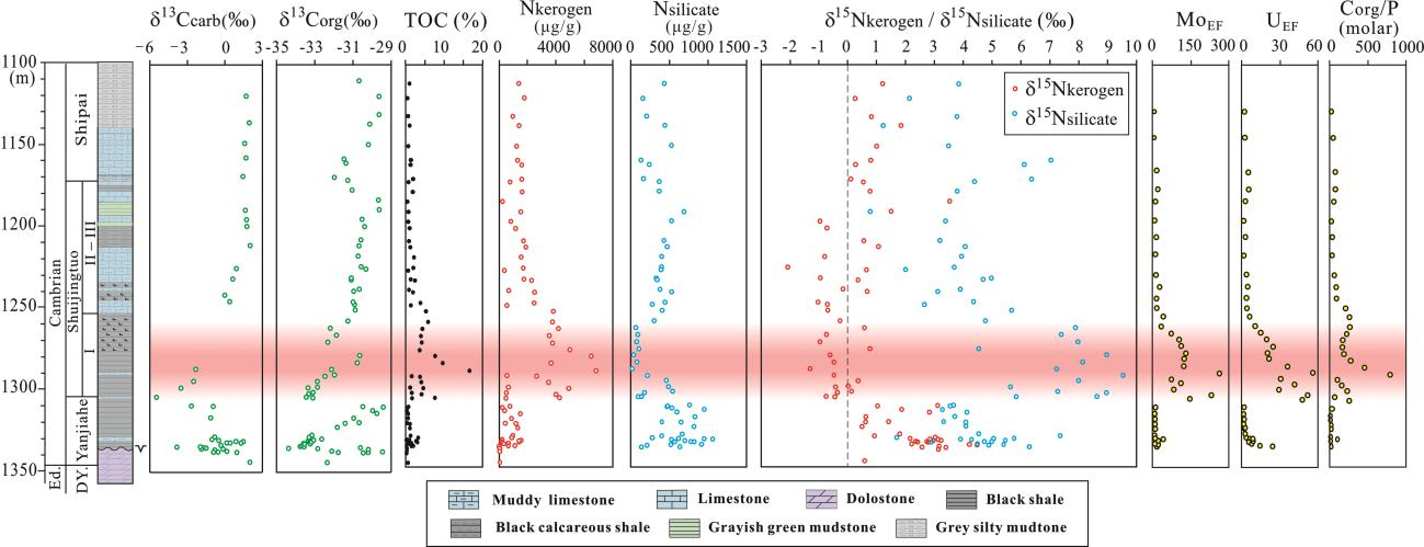 我院陈法锦教授、曹瀚升副教授及其课题组成员,以华南板块千米深钻为研究对象(图1),通过高分辨率硅酸盐结合氮(δ15Nsilicate)与干酪根结合氮(δ15Nkerogen)对华南扬子地块下寒武统严家河组至石牌组进行高分辨同位素分析,旨在揭示寒武纪早期古海洋氮循环过程及碳—氮循环耦合机制。