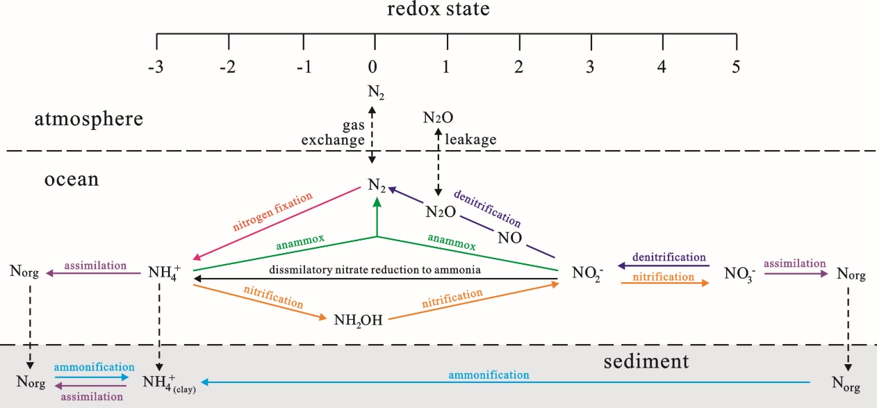 氮作为生命必需元素,其循环对海洋环境变化高度敏感。传统研究主要依赖沉积有机氮同位素(δ15Nbulk)解析古海洋氮循环,但受多种复杂过程叠加影响,结果难以准确反映真实情况(图1)。近年来,研究发现沉积氮不仅存在于有机质中,还可通过固定铵(NH4+)形式进入硅酸盐矿物晶格,形成“硅酸盐结合氮”。这一无机氮形式在成岩过程中稳定性较高,能够独立记录海洋氮循环的关键信息。特别是对厌氧氨氧化(Anammox)等特定代谢途径的信号捕捉,为重建古海洋氧化还原结构和碳-氮耦合机制提供了新视角。