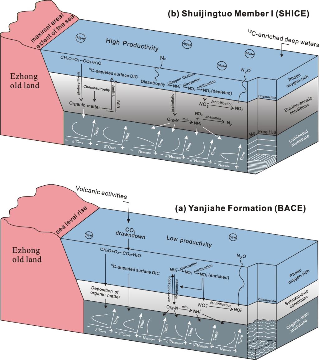 埃迪卡拉纪-寒武纪过渡期是地球环境和生命演化的重要转折点。这一时期,全球海平面上升、海洋氧化还原条件波动剧烈,导致生物灭绝与辐射事件频发。特别是埃迪卡拉生物群和小壳动物群的相继灭绝,与碳同位素多次显著负偏移(如BACE和SHICE事件)密切相关。这些碳同位素异常通常被认为是深部缺氧水体上升或火山活动释放CO2的结果,但其具体机制仍存在争议。传统观点认为,早寒武世浅海缺氧事件的扩张导致有机碳埋藏减少,从而引发碳同位素负偏移。然而,这一解释未能充分揭示碳-氮循环之间的耦合关系及其对生物地球化学过程的调控作用。