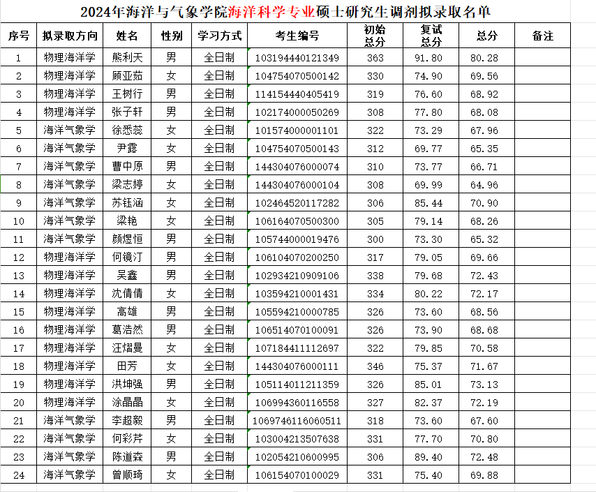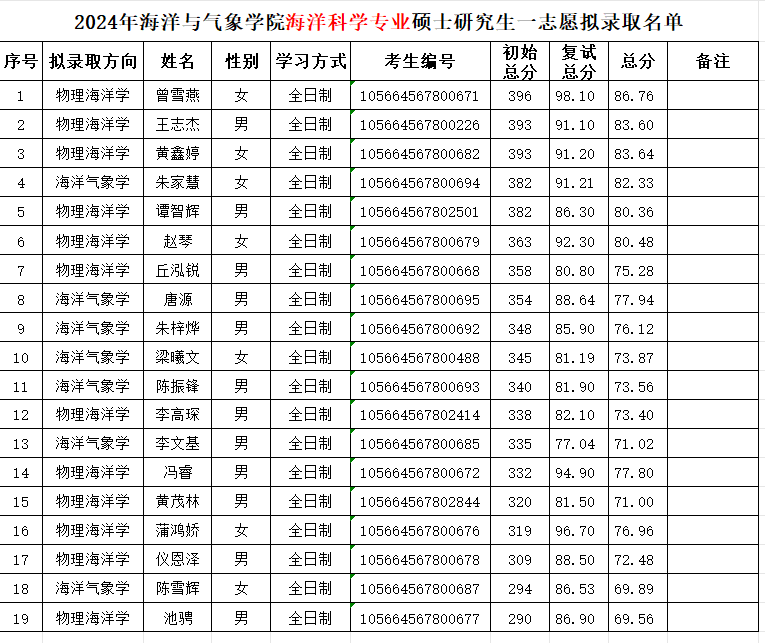 现将优直播 海洋科学专业2024年硕士研究生一志愿及调剂拟录取学生名单予以公示,公示期为3个工作日,即4月26日-4月28日。公示期内如对结果有异议,可以书面形式向优直播 予以提出。