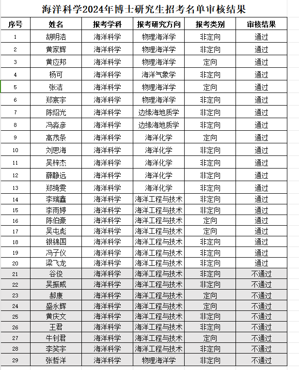 根据我校博士研究生招生录取有关文件的规定,结合《优直播-英超直播优直播2024年全日制博士研究生招生章程》及《海洋科学学科2024年博士研究生招生考试工作方案》的相关要求,现对海洋科学博士招考学生资格审查结果予以公示。公示期为5日(即从2024年5月1日-5月5日),公示期内如对审查结果有异议,请以真实姓名及书面形式向海洋科学招生领导小组提供相关信息(联系人:曾老师,联系电话:2396095)。